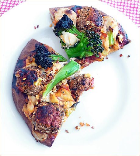 I wanted to make something from the meatless mains chapter, and since I had a ton of cheese, and a stack of frozen pizza crusts from a local restaurant, it seemed logical to make a meatball and mozzarella pizza. Wouldn't you? The meatballs were tasty, with a slightly chewy texture. Though they didn't taste like meat, they looked like it, and they tasted great.